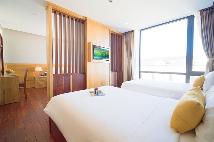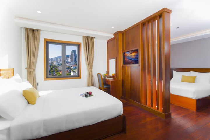 The Suite Family Room at Sunny Ocean Hotel & Spa offers spacious space, ideal for families or groups of friends. With modern design and beautiful views of both the city and the sea, the room promises to bring you comfort and relaxation during your stay. The room is fully equipped, bringing maximum convenience to guests. The hotel offers a variety of services such as buffet breakfast, a bar overlooking the sea, a swimming pool and a spa, creating a relaxing and vibrant vacation. The staff is always ready to assist you with tourist information so you can explore the highlights of Da Nang.